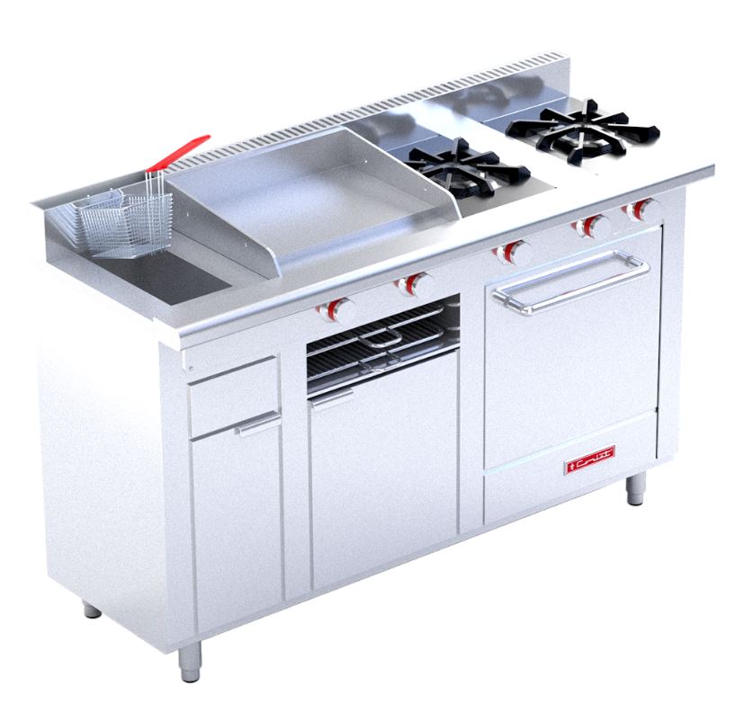 Exteriores e interiores fabricados en lámina de acero inoxidable.Plancha 1 Plancha cold rolled steel 3/4" de espesor, área útil de: frente: 0.576 m, fondo: 0.344 m. 1 Gratinador de 0.540 m de frente. 2 Quemadores en "U" A.Inox. de 17,600 Btu/h c/u. 2 Pilotos individuales A.Inox. 2 Válvulas de ajuste flama piloto importadas, certificadas CSA uso...